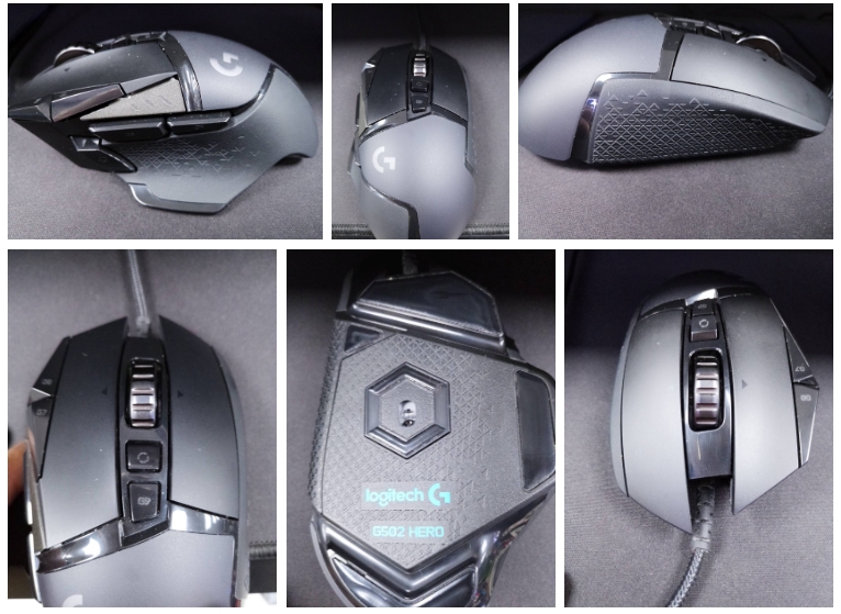Logitech G502 Hero의 외관은 게이밍 마우스라는 것을 손쉽게 알수 있을 만큼 눈에 뜁니다. 특히 엉덩이가 높은 편이며, 이로인하여 오른손잡이 게이머에게 뛰어난 그립감을 제공합니다. 왼쪽 사이드버튼에는 FPS 게임 중 손쉽게 DPI변경할 수 있는 버튼이 있으며, 총 10개의 버튼을 지원합니다. 이 버튼 모두 G Hub를 통하여 사용자 정의에 맞게 커스텀이 가능합니다. 전체적으로 높은 정확도를 위하여 밑부분에 고무처리가 되어져 있으며, 오른쪽 사이드에는 큼직만한 고무처리가 되어 있습니다. 특히 Logitech G502 Hero의 클릭버튼은 다른 마우스들과 조금 다르게 비대칭이며, 클릭 좌우측의 길이가 다르게 되어 있습니다.