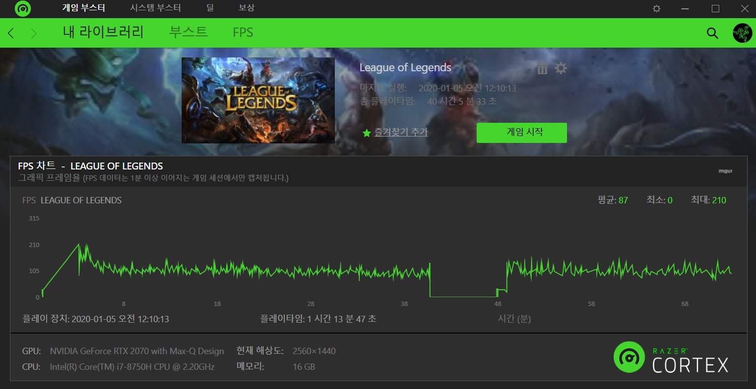 FPS 일부 설정 시 게이밍 플레이 종료 후 모든 프레임이 표시됩니다. LOL 총 2판을 플레이 하였으며, 평균 프레임 최소프레임 최대 프레임이 표시됩니다.