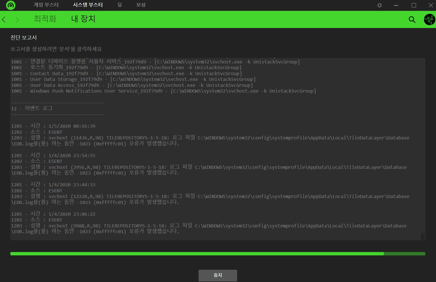 부가기능으로는 진단분석이 있으며, PC의 전체적인 성능적인부분이나, 이벤트 로그 등을 알수 있습니다. 진단서 프로그램을 통하여 알 수 있는 항목은 아래와 같습니다.