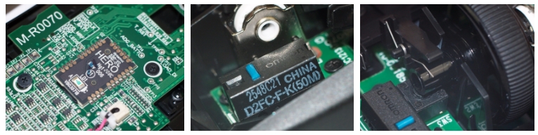 Logitech G Pro Wireless는 Hero 16K 센서는 Logitech에서 하이엔드 마우스에 적용되는 센서 입니다. 성능은 PMW3366과 비슷하지만, 배터리효율적인면에서는 Hero 16K 센서가 압도적인 성능을 보여주고 있습니다. 따라서 무선 마우스에는 Hero 센서를 선택하는 것이 매우 바람직합니다. 스위치는 5000만번의 클릭을 보장하는 Omron D2FC-F-K 스위치를 사용하고 있으며, 스크롤 휠 같은 경우 일부 스프링처리가 되어 있어 정확한 스크롤 휠 느낌을 들게 해줍니다.