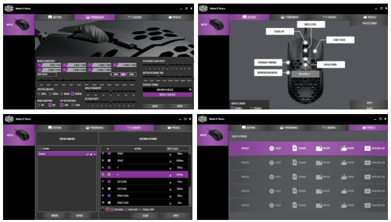 COOLER MASTER MASTERPLUS를 통하여 마우스의 다양한 설정이 가능합니다. 의외로 SW의 호환성이 좋은것 같았으며, 별다른 오류없이 사용이 가능하였습니다. 또한 마우스 감도, 클릭 속도, 응답시간, LOD 설정, 폴링레이트, 등 가능하였으며, 마우스의 메크로 설정도 가능하였습니다.