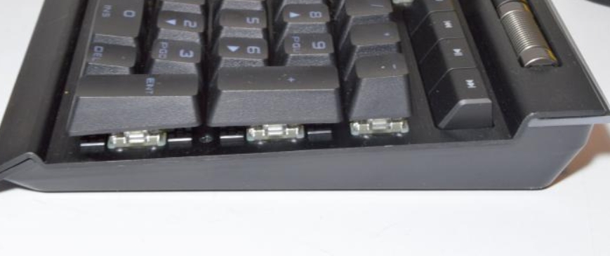 블랙 컨셉이나 무난한 PC 조합을 지향하시는 게이머라면 꼭 추천드리고 싶은 키보드 입니다. 오른쪽에는 커스텀이 가능한 단축 메크로키가 있으며, 오른쪽 숫자배열 키 위에는 볼륨 및 멀티미티어 키와 왼쪽 상단에는 3개의 설정키가 배열되어 있습니다. 또한 인체공학 설계로 키캡 배열마다 약간의 높이가 있습니다. 또한 사용자 용도에 따라 2중으로 높낮이를 조절하실 수 있습니다.