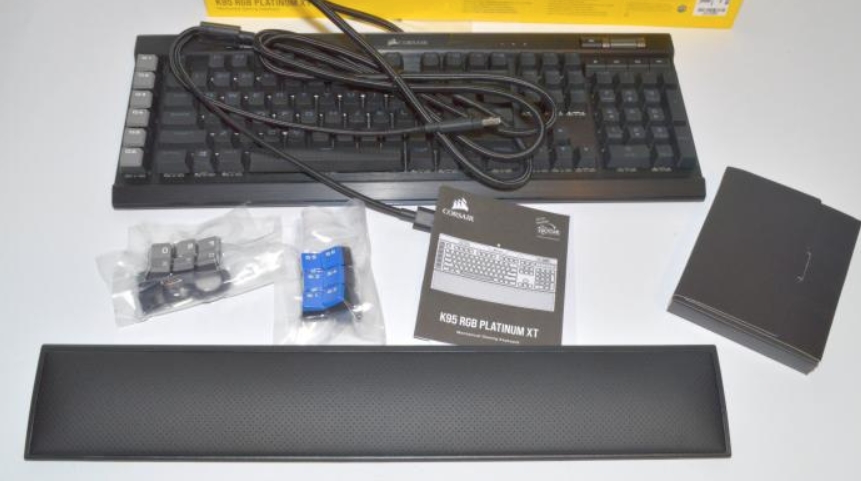 Corsair K95 RGB Platinum XT 제품의 박스는 Corsair를 나타내는 컬러 노란색과 블랙의 조화로 이뤄져 있으며, 매우 심플하게 포장되어 있습니다. 2층 구조로 되어 있으며, 1층에는 키보드와 아래에는 설명서, 그리고 제일 밑부분에는 탈착식 손목 보호대가 동봉되어 있습니다. 또한 커스텀 가능한 여분의 키캡이 동봉되어 있습니다.
