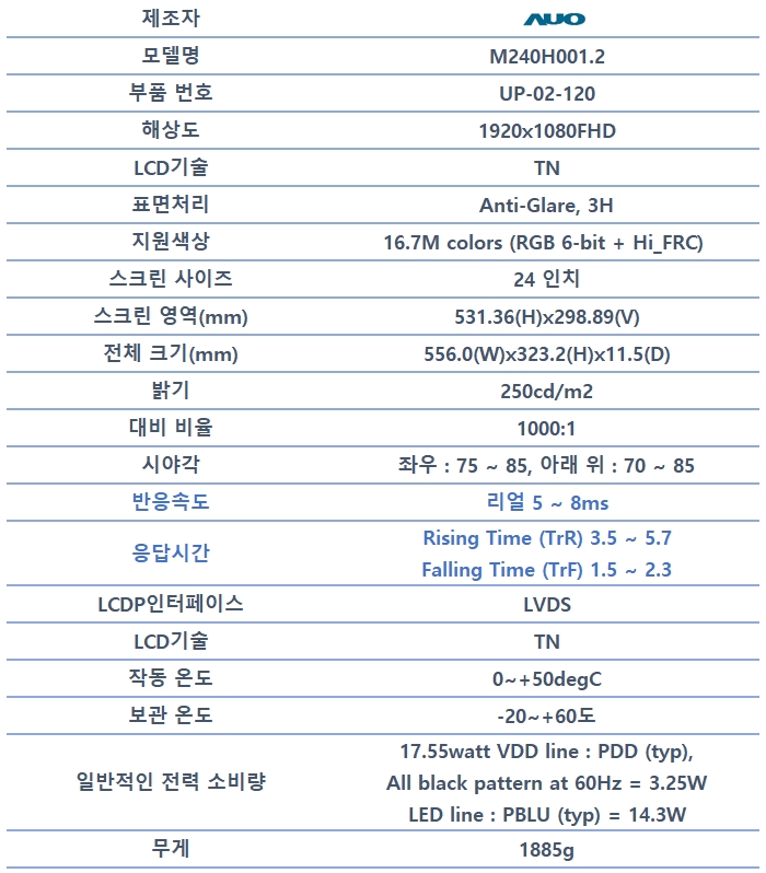 오늘의 리뷰는 AUO 24인치 M240HTN01.2 패널, 리얼 반응속도 인풋렉, 주사율, 정보 입니다.