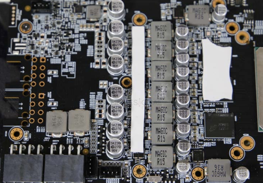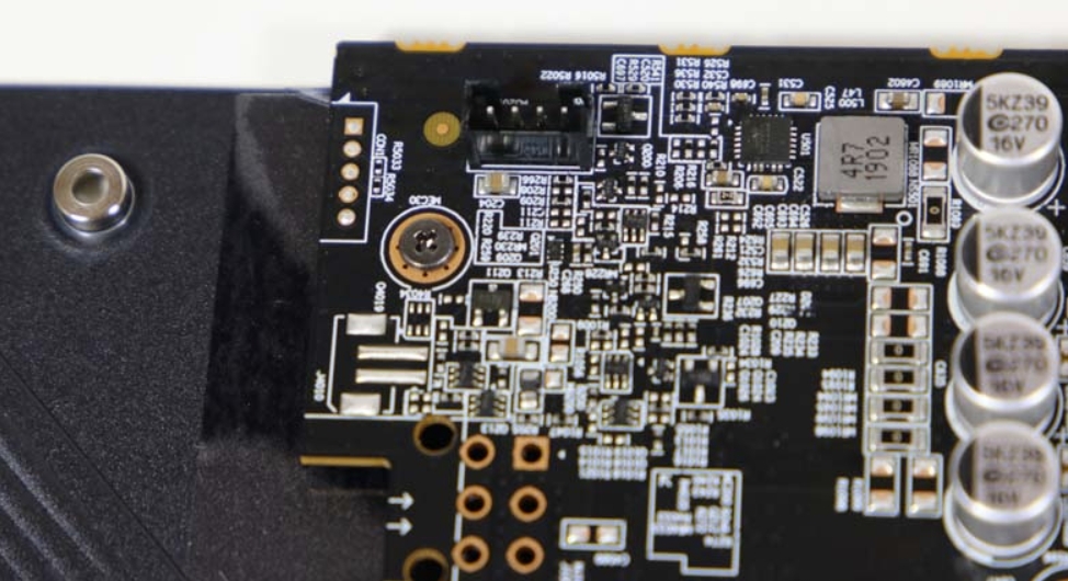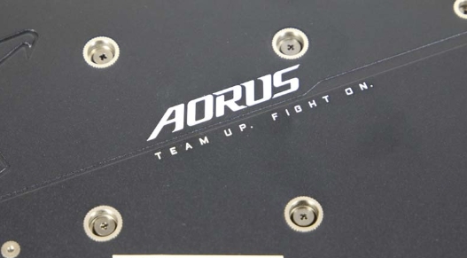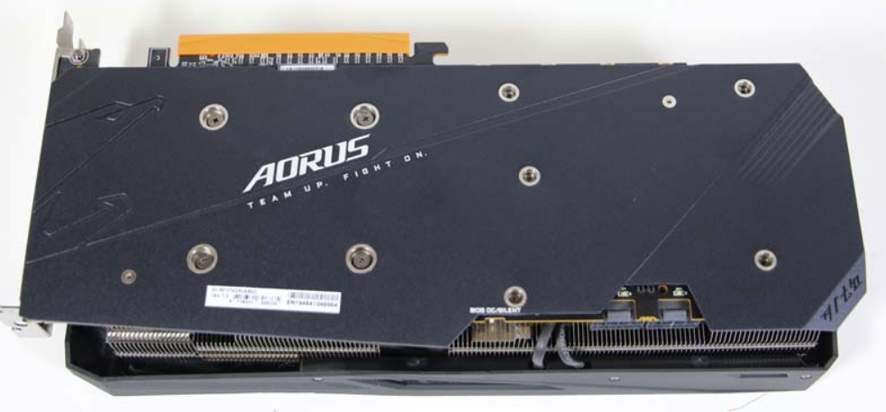 AORUS Radeon RX5700XT 제품의 백플레이트는 아노다이징 처리된 알루미늄으로 되어 있으며, Aours Logo 및 독수리 이미지 각인이 되어 있습니다. 두깨는 매우 적당한 백플레이트로 되어 있으며, 고급스러움을 주기 위하여 심플하고 간결하게 마감이 되어 있습니다.