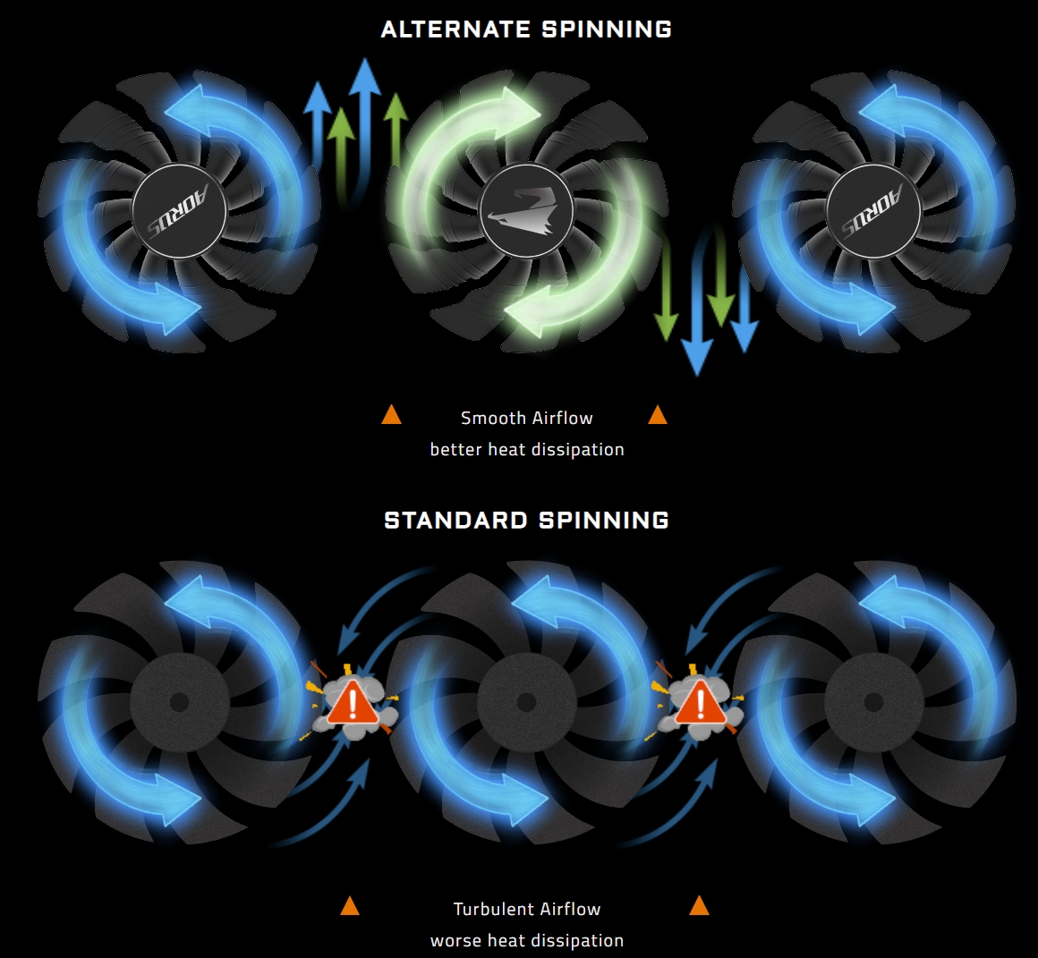 윈드포스 스텍 3X 동작 원리는 양쪽 팬은 시계방향으로 회전한다면 가운데 팬만 시계 반대방향으로 회전하게 됩니다. 이로인하여 그래픽카드의 발열을 빠르게 제어할 수 있는 Aorus만의 쿨링 시스템 입니다.