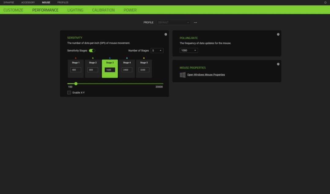 기본 민감도 설정 버튼 조정(400, 800, 1600, 2400, 3200) 레이저 시냅스를 통한 유저가 원하는 민감도 설정 가능(X, Y 축 따로 설정 가능)