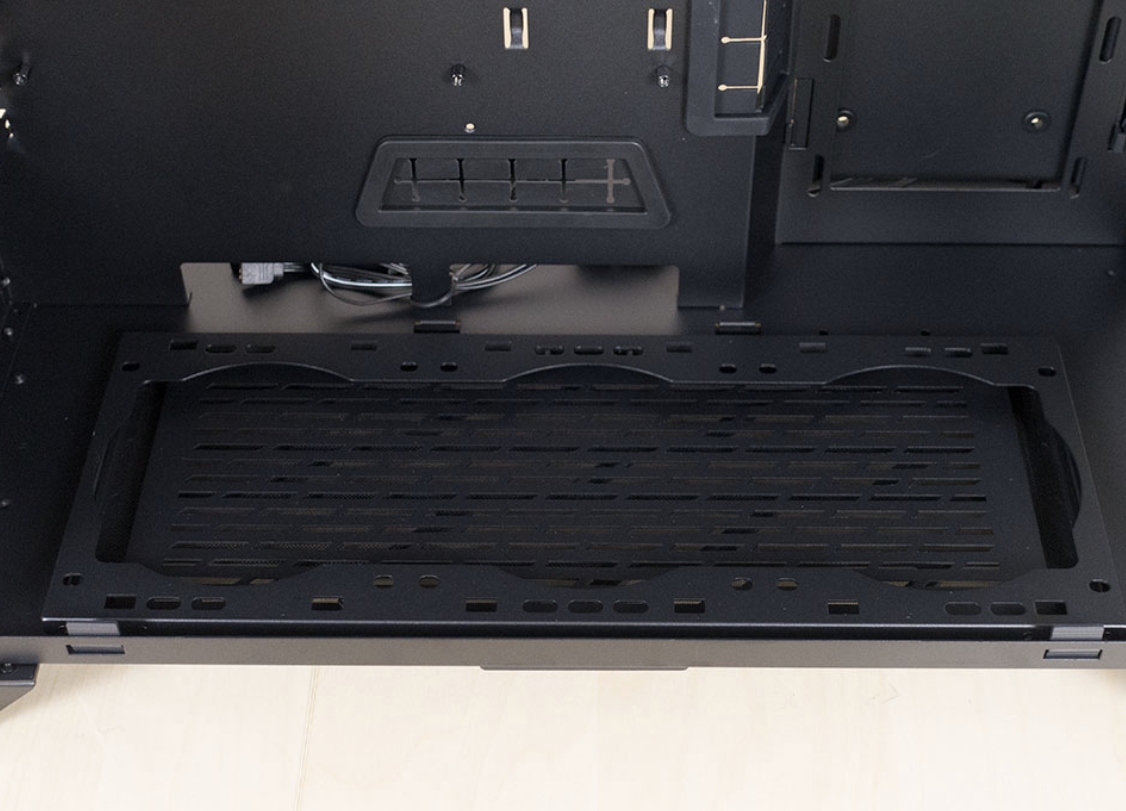 밑부분 같은 경우 윗부분 같이 먼지 필터가 존재하며, 120mm X 3 / 140mm X 2(Option) 설치 할 수 있으며, 최대 360mm의 라디에이터를 사용할 수 있도록 설계되어 있습니다.