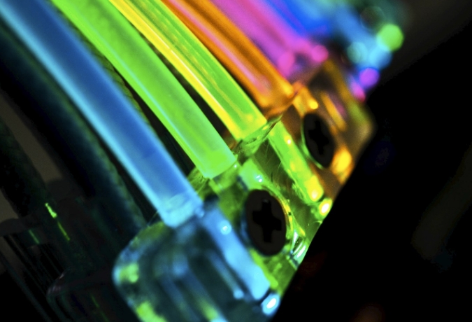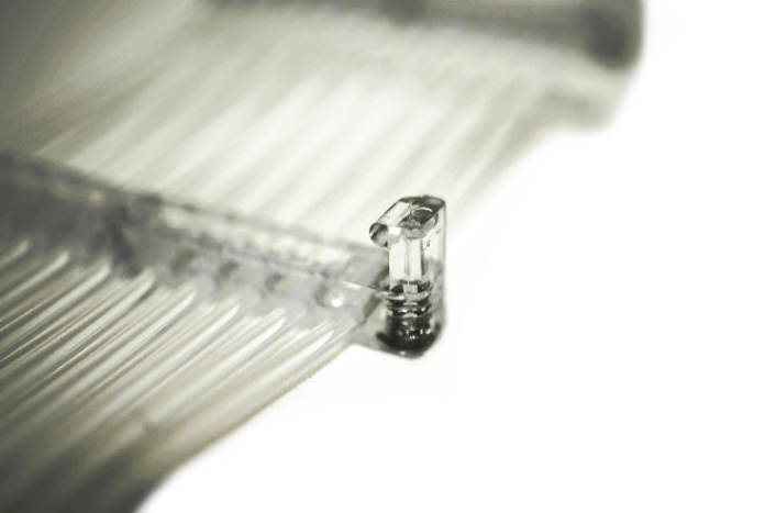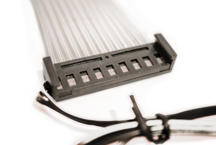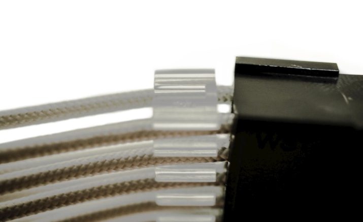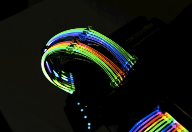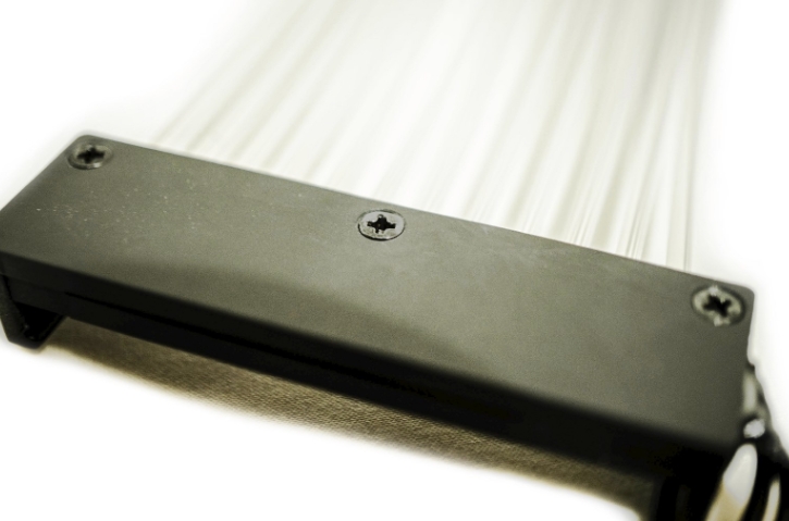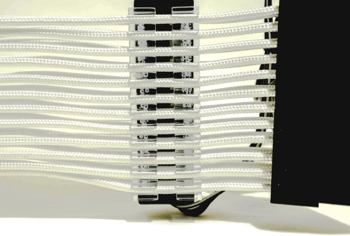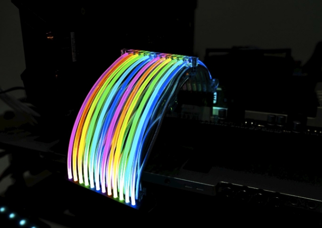 Lian-Li STRIMER RGB 24핀 케이블 제품은 2중 구조로 첫번째 광 섬유 케이블이 제일 위쪽에 장착됩니다. 기본적으로 전원 공급 장치 케이블위에 장착할 수 있으며, 매우 부드러우면서도 균일하게 컬러감을 유지해줍니다.