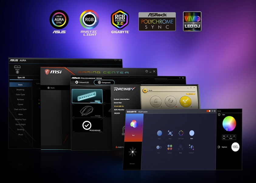 AURA Sync, MYSTIC Light, GIGABYTE RGB 2.0, ASRock Polychrome, RGB Fusion 지원 |