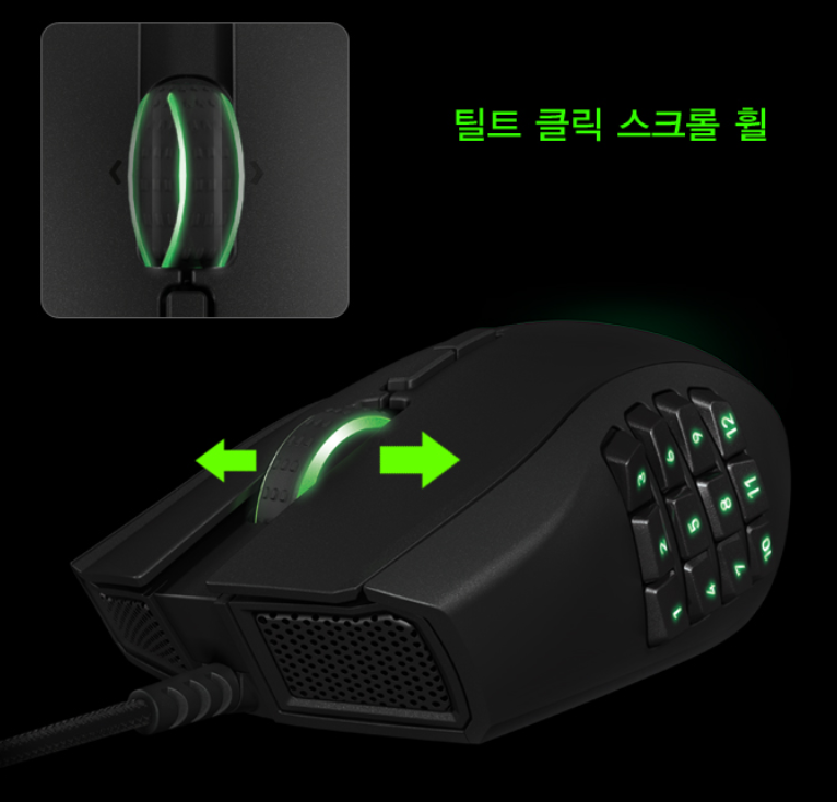 Razer naga Chroma 틸트 클릭 스크롤 휠이란 휠의 좌우 방향에도 Key 설정이 가능하며 실제로 사용이 가능하다. 또한 MMORPG 특성에 맞춰 화면이 위아래로 이동이 된다.