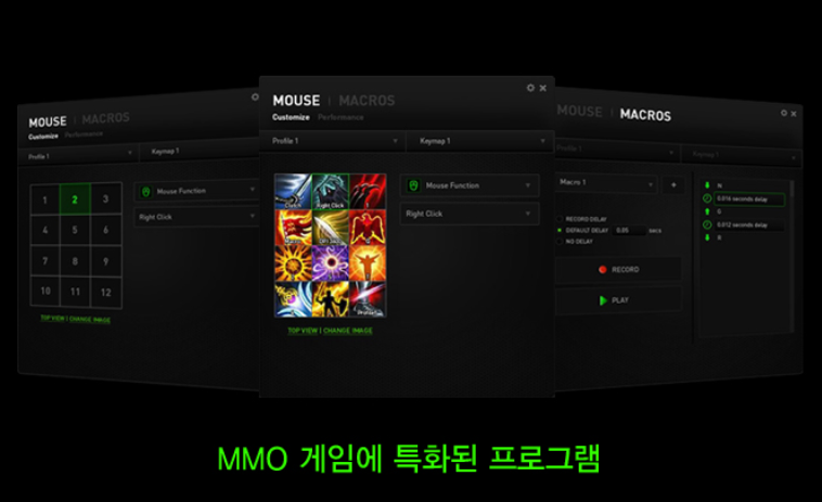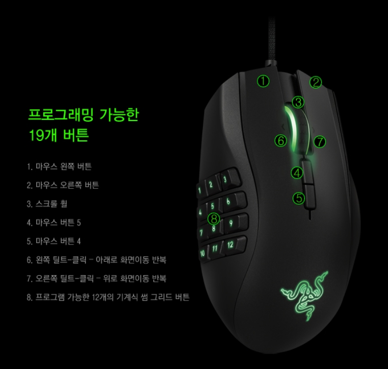 사이드 버튼의 역활은 Razer 전용 프로그램을 통하여 각각 스킬 및 다양하게 커스텀마이징 할 수 있습니다.