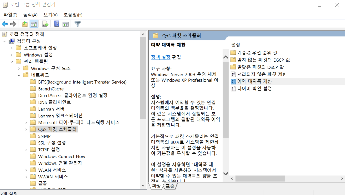 | 컴퓨터 구성 > 관리 템플릿 > QoS 패킷 스케줄러 > 예약 대역폭 더블 클릭 |