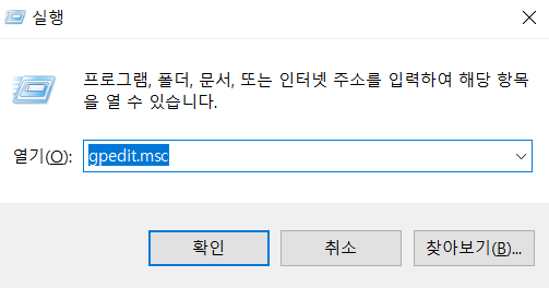 실행창이 뜨게되면 gpedit.msc 입력을 해주세요.