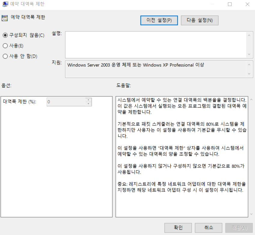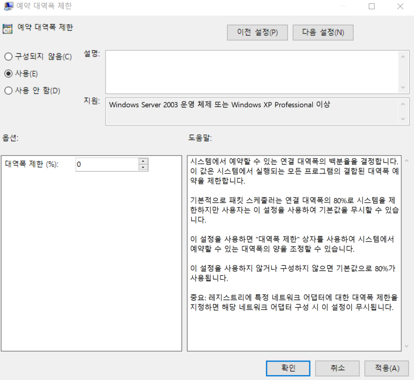 | 예약 대역폭 제한 > 사용 클릭 > 옵션에서 대역폭 제한(%) 0으로 변경 > 적용 > 확인 클릭 |