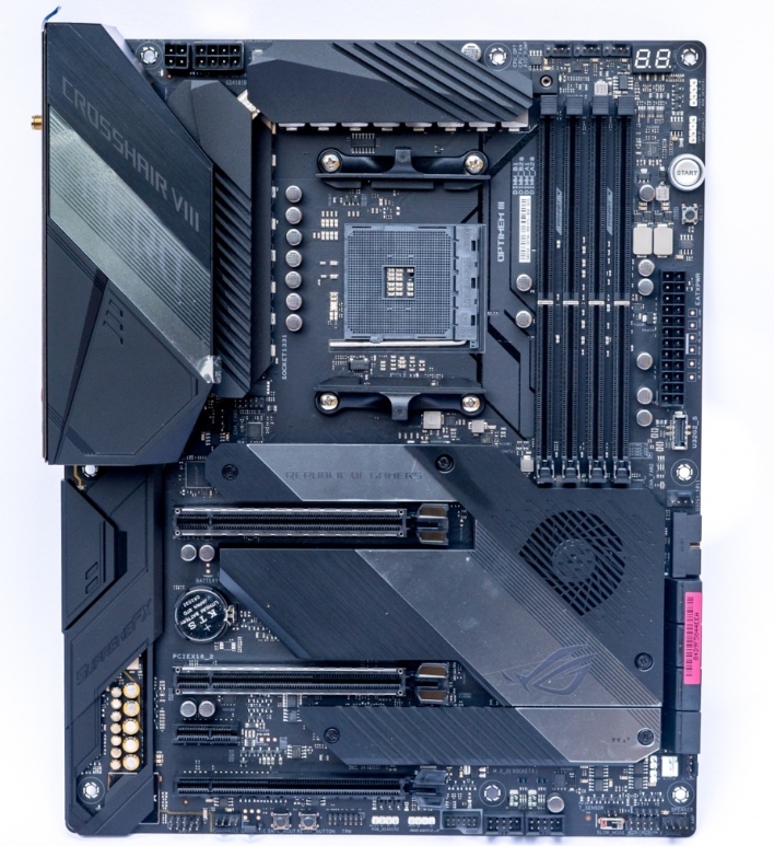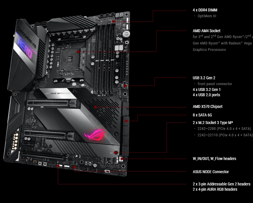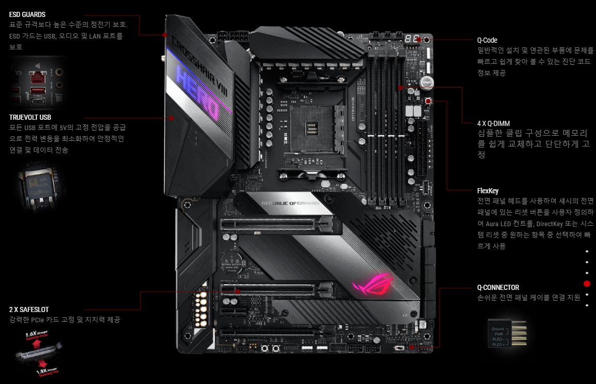 Asus X570 ROG Crosshair VIII Hero Wi-Fi 외관은 AMD Ryzen CPU의 발열을 해소하기 위하여 두툼한 히트싱크로 구성되어 있으며, 처음 보았을때 Asus의 감성을 느껴볼 수 있었습니다.