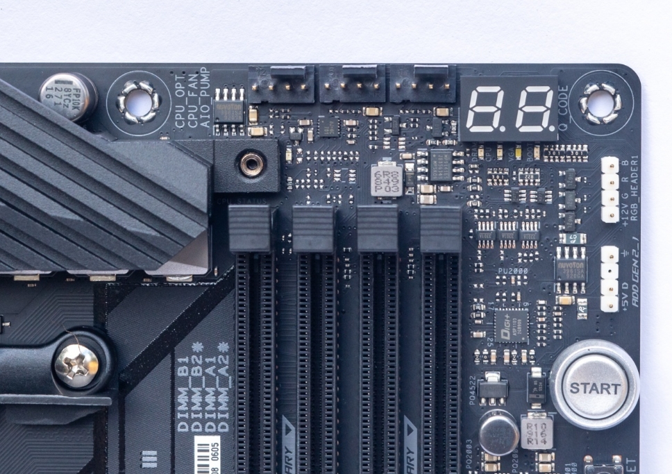 4개의 RAM 슬롯을 지원하며 매우 심플한 구성으로 메모리를 쉽게 장착, 탈착을 할 수 있습니다. 또한 미세하지만 자리 배치 구조가 공랭쿨러 / 수냉쿨러에 간섭을 최소화하기 위해 기존에 비하여 약간의 여유 공간을 주어 간섭을 최소화한 모습을 확인할 수 있습니다.