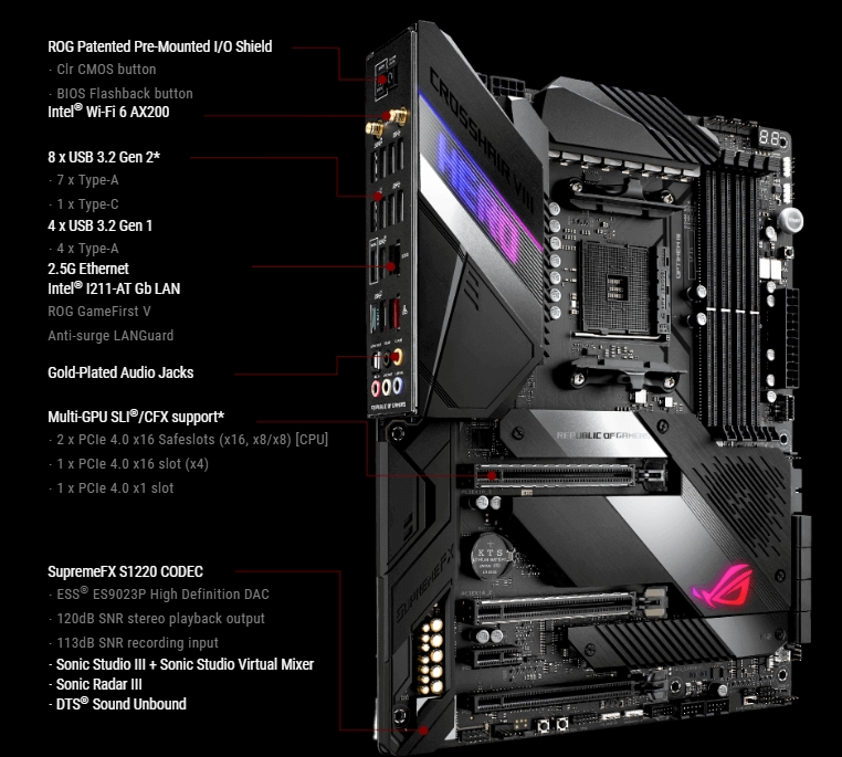 | Audio | ROG SupremeFX 8-Channel High Definition Audio CODEC - Impedance sense for front and rear headphone outputs - Supports : Jack-detection, Multi-streaming, Front Panel Jack-retasking - High quality 120 dB SNR stereo playback output and 113 dB SNR recording input - SupremeFX Shielding Technology - ESS® ES9023P - Supports up to 32-Bit/192kHz playback Audio Feature : - Sonic Studio III + Sonic Studio Virtual Mixer - DTS® Sound Unbound - Optical S/PDIF out port(s) at back panel - Sonic Radar III * Due to limitations in HDA bandwidth, 32-Bit/192kHz is not supported for 8-Channel audio |