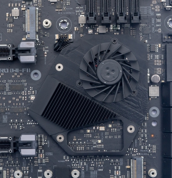 모스펫, 초크, 캐시피터에 매우 뛰어난 제품을 사용하여 전원부에 전력 공급이 원활히 될 수 있도록 하였습니다. 이로인하여 16코어를 지원하는 AMD 3950X CPU도 성능저하가 일어나지 않고 높은 퍼포먼스를 보여줄 수 있을 것으로 확인됩니다.