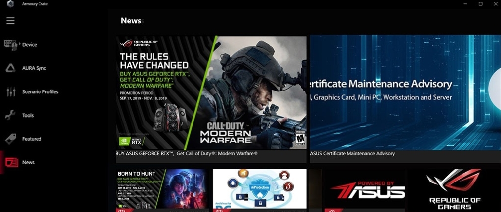 | Aura Sync | 제품 연동 | 드라이버 다운로드 | 게임 관련 정보 | 뉴스 |