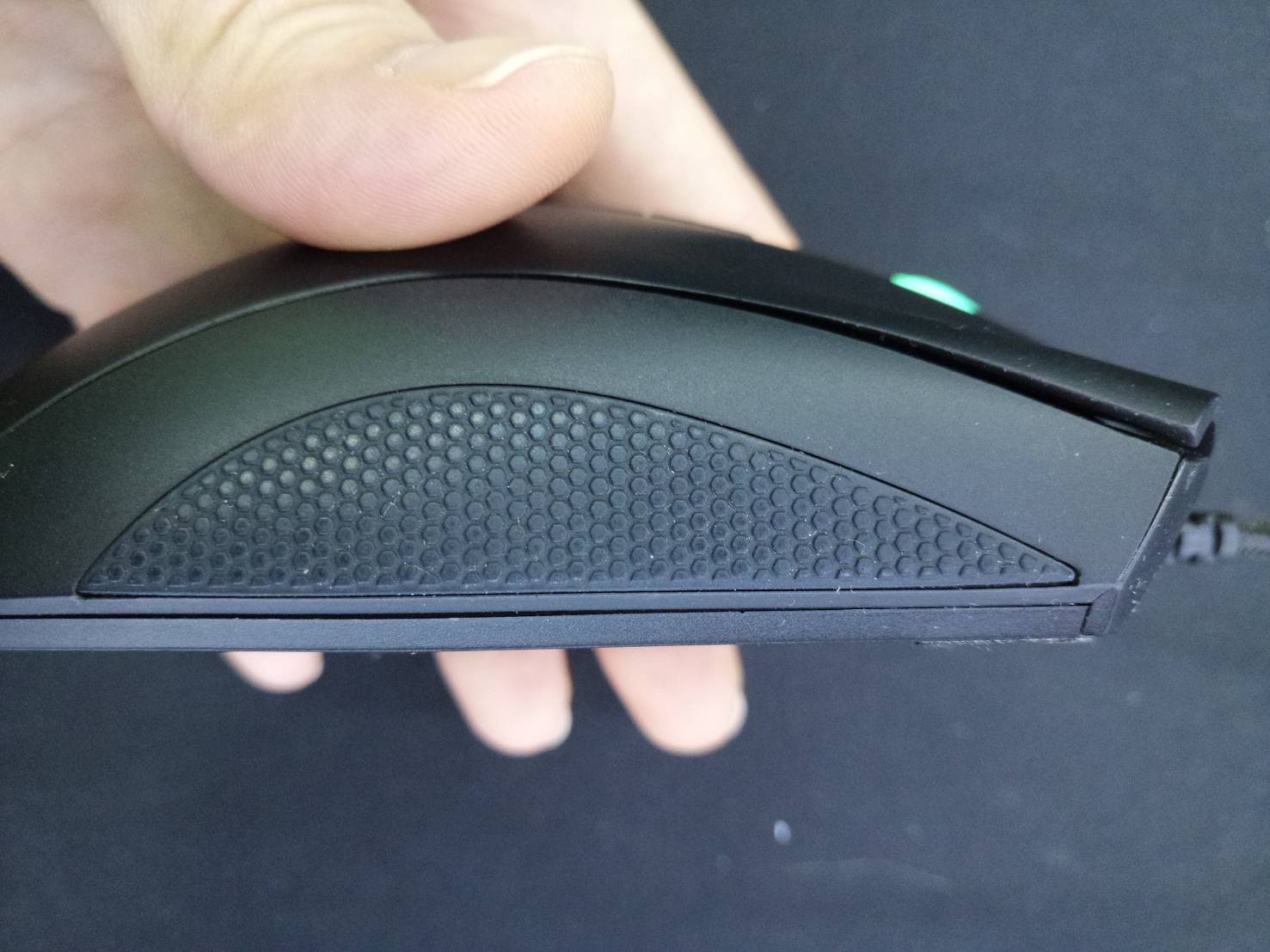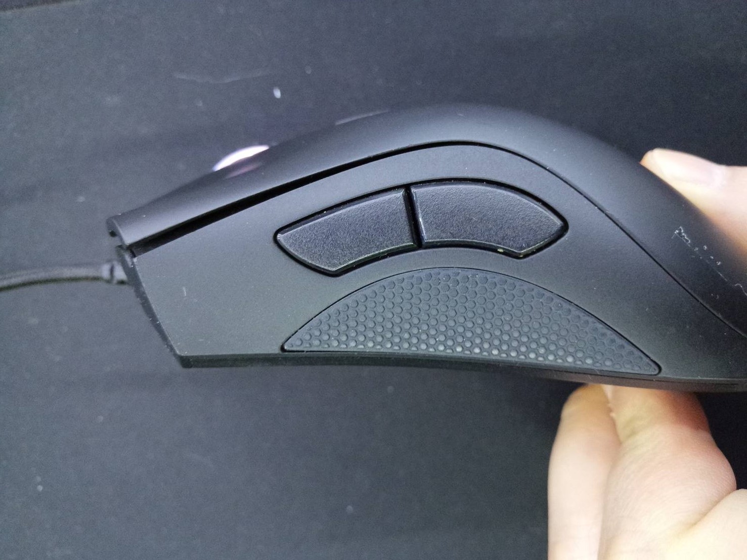 Razer Deathadder Elite 는 오른손 게이머에게 매우 편안하고 고급스러운 그립감을 제공하기 위하여 평행 버튼이 아닌 약간의 비대칭 클릭 버튼으로 되어 있습니다. 엉덩이의 돌출은 큰 편은 아니나 마우스 자체가 조금 큰편에 속합니다.