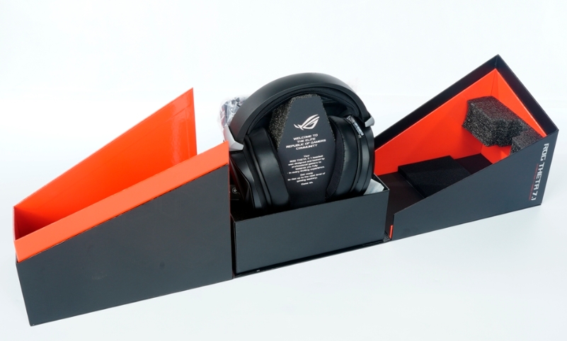 ASUS ROG Theta 7.1 제품은 Asus ROG를 연상 시킬만한 컬러감 박싱으로 구성되어져 있습니다. 주황색과 검정색 조합으로 되어 있으며, 제품 상자는 일반적인 포장기법이 아닌 입체적 제품 박싱을 선택하였습니다. 구매한 사람을 항상 기분 좋게 해주는 박싱 구성이며, 매우 고급스러움이 느껴집니다. 제품 안에는 메모리폼, 마이크, 설명서, 케이블, 헤드셋이 동봉되어져 있습니다.