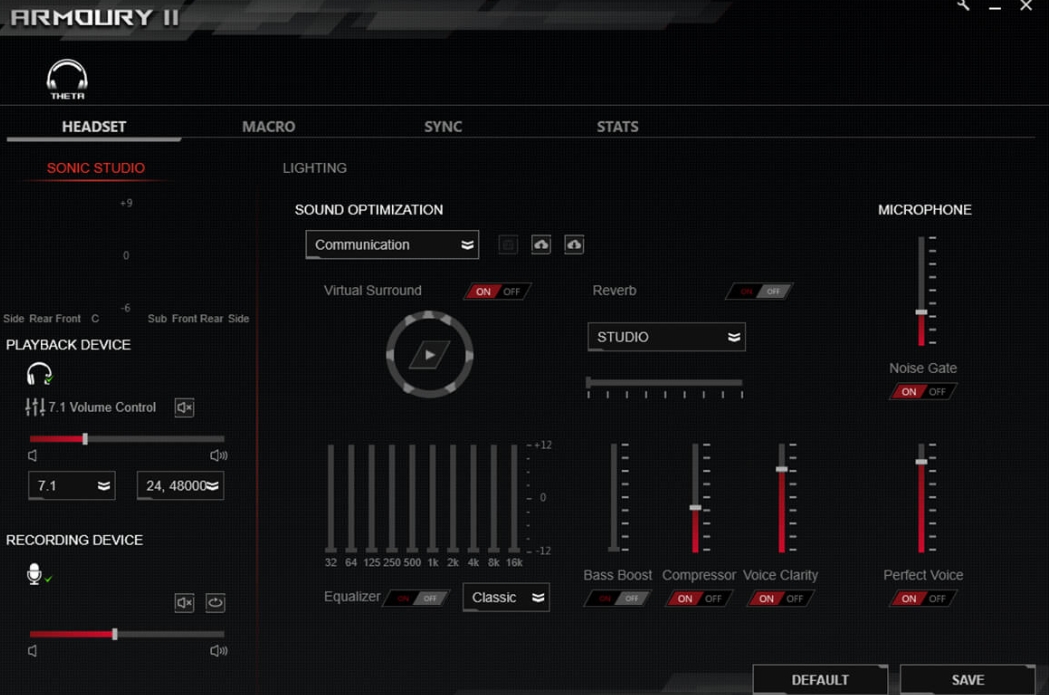 ASUS ROG Theta 7.1 제품은 SW를 통한 헤드셋의 설정이 가능합니다. 전체적인 음향 밸런스와 RGB 그리고 제품간 Sync까지 연결이 가능합니다. 또한 리얼 7.1에서는 전체적인 음향 밸런스가 다운되는 현상이 있으며, 이는 SW의 사운드 설정을 통하여 해결이 가능합니다.