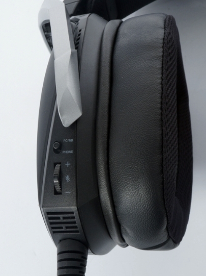 이어폰 부분에는 탈착형 마이크를 지원하는 포트와, 한쪽에는 7.1 서라운드 및 스트레오 모드를 조절할 수 있는 컨트롤러가 배치되어 있으며, 음량조절 및 마이크, LED까지 손쉽게 설정하실 수 있습니다.