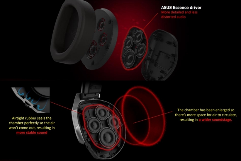 ASUS ROG Theta 7.1 제품의 이어폰에는 2가지 타입의 메모리폼 제공이되며, 폼을 제거 시 7.1채널을 느끼게 해줄 수 있는 양쪽 합 8개의 Asus Essence 드라이버를 확인하실 수 있습니다. 이 드라이버를 통하여 매우 뚜렷하고 깨끗한 서라운드 음질 효과를 청취하실 수 있습니다.