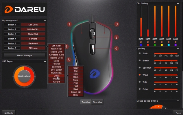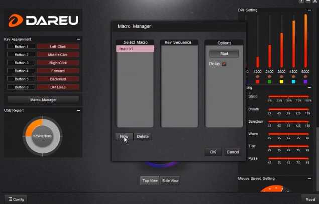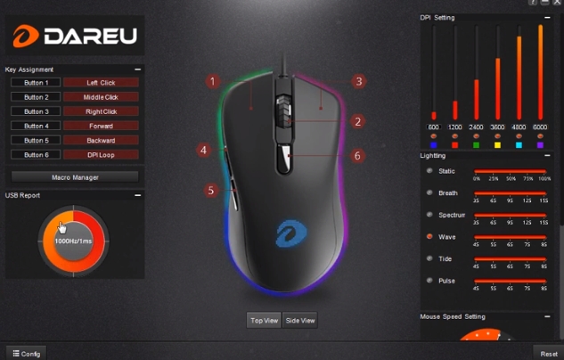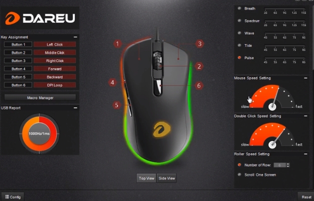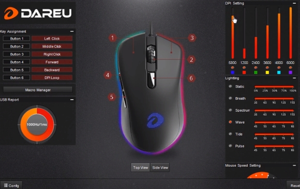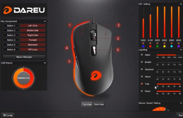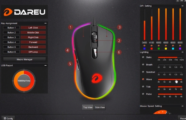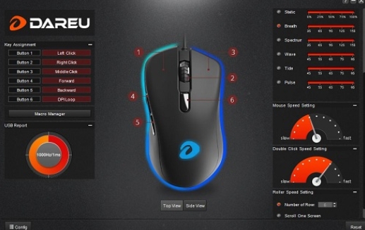 DAREU EM908 RGB 제품은 매우 심플하고 사용하기 편한 소프트웨어를 지원합니다. 다른 제품간 Sync는 불가능하며, 마우스에 대한 RGB 설정과, CPI 설정 그리고 마우스 버튼에 대한 설정이 가능합니다.