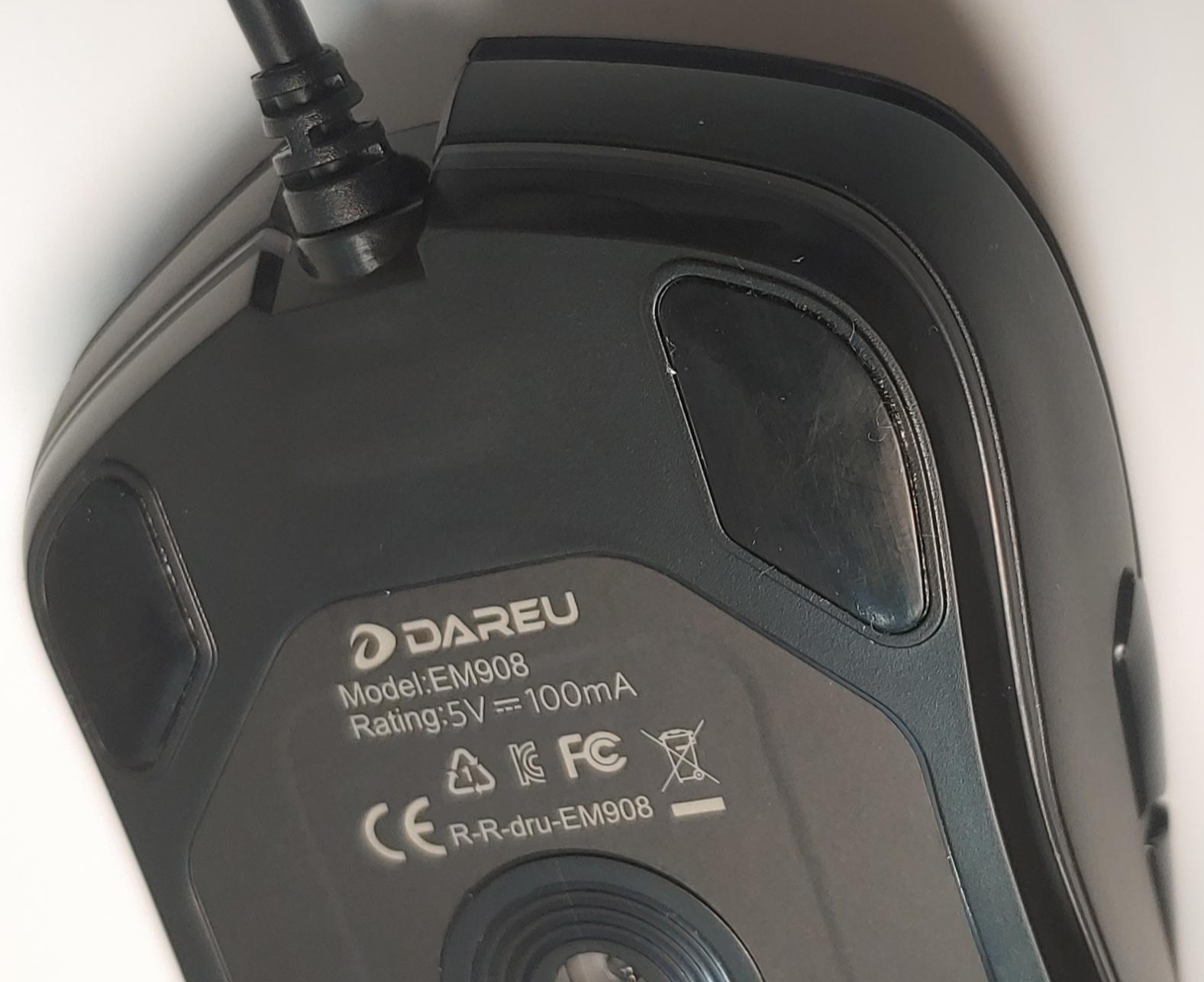 DAREU EM908 RGB 제품의 스케이트는 전체 면적의 최소치인 10%정도로 확인되며, 표면면적과 매우 근접하게 붙어있는 타입의 마우스 입니다. 이로인하여 마우스의 LOD(Lift Off Distance)에서는 높은 정밀도를 보여줄 것이라 생각합니다.