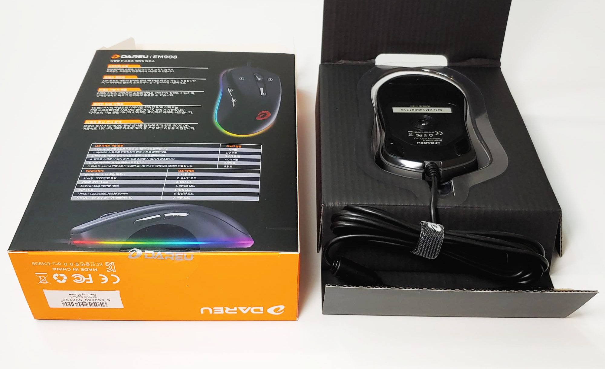 DAREU EM908 RGB 제품은 다얼유를 상징하는 주황색과 검정색의 박싱 컬러로 되어있습니다. 박싱은 매우 기본적인 마우스 포장 박스로 되어있으며, 내부의 동봉품으로는 마우스와 설명서가 동봉되어 있습니다.