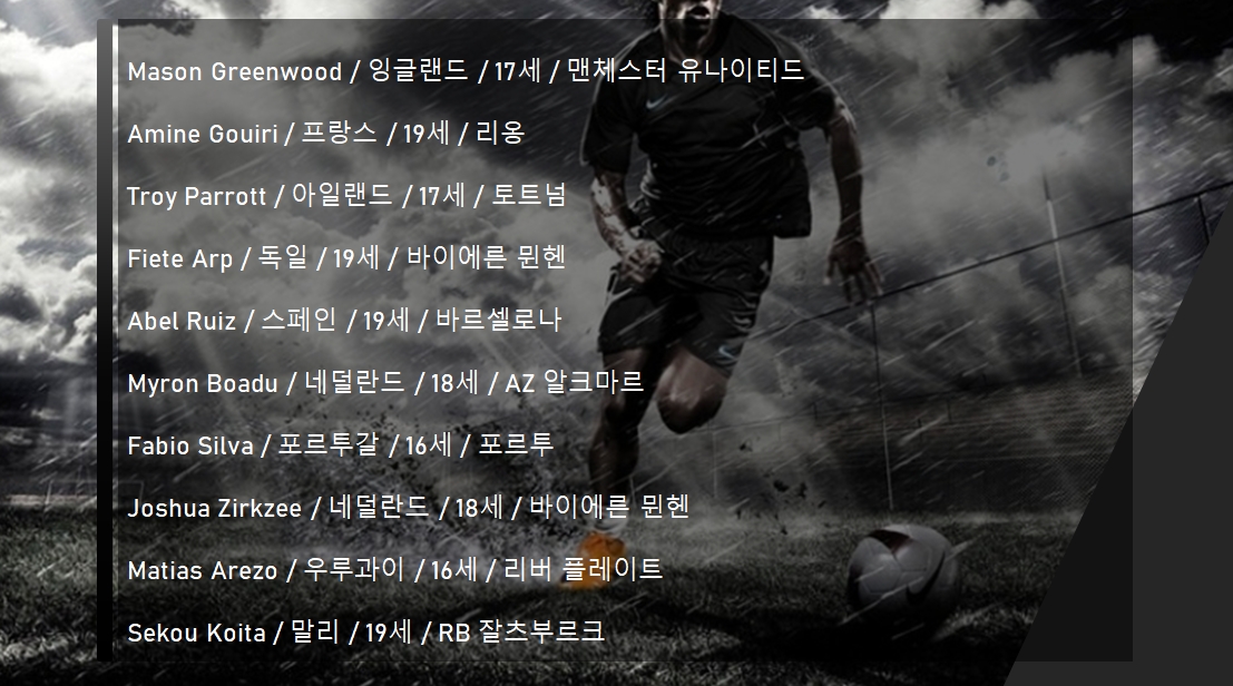| Mason Greenwood | 17 | 잉글랜드 | 맨체스터 유나이티드 |