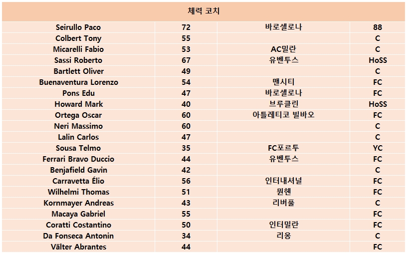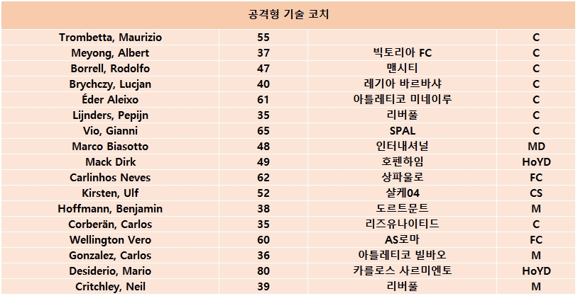 각 전술형에 따른 기술, 공격, 수비, 전술형 코치 포텐별 리스트이며, 각각 최상위 코치진을 섭외하실 경우 훈련시 유망주의 포텐이 MAX까지 역활에 따른 스탯이 비약적으로 상승되는 효과를 얻을 수 있습니다.