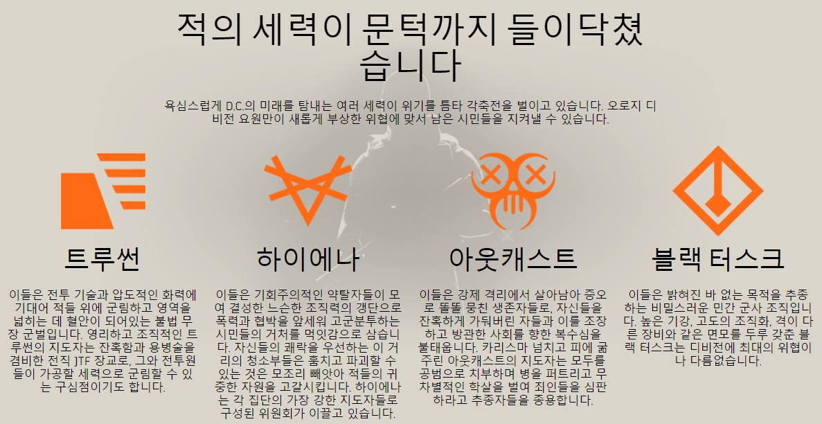 매시브 엔터테이먼트가 개발하고 유비소프트가 배급한 온라인 액션 롤플레잉 FPS 게임 입니다. 롤플레잉이 내용에 삽입된것을 확인할 수 있는 것처럼 RPG처럼 아이템에 등급이 존재하며, 다양한 파밍 루트를 통하여 아이템을 맞춰가게 됩니다.