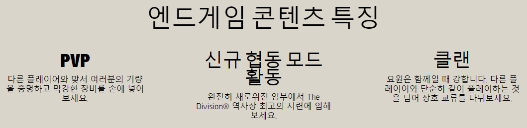 DIVISION2 에서는 워낙 방대한 컨텐츠와 전문성 등으로 인하여 다양한 플레이를 즐길 수 있습니다. 또한 만렙을 찍는다고해서 게임이 끝나는것이 아니라 협동모드, PVP등을 통하여 지속적인 게임 플레이가 가능합니다.