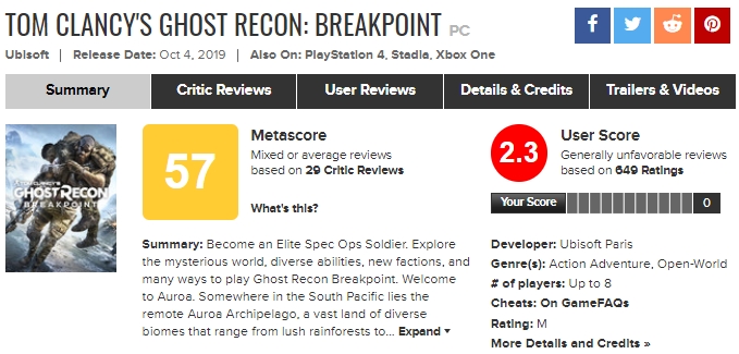 Ubisoft가 개발하고 배급하고 있는 게임이며, 2019년 10월 4일에 발매된 최신 게임 중 하나 입니다. TomClancy 브랜드로 11번째 작품이며, 2017년에 나온 Ghost Recon의 후속작이기도 합니다.