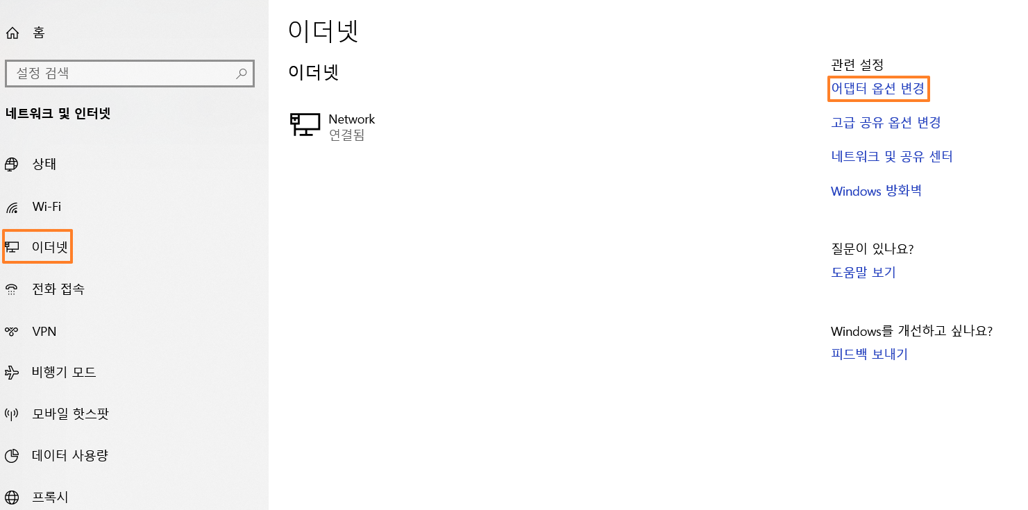 진입 하시게 되면 위와 같은 창이 뜨는데, "네트워크 연결" 항목을 클릭 합니다.