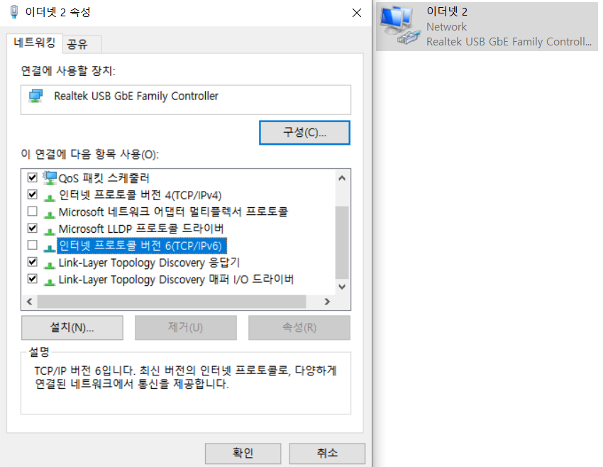 인터넷 프로토콜 버전 6{TCP/IPv6) 해제