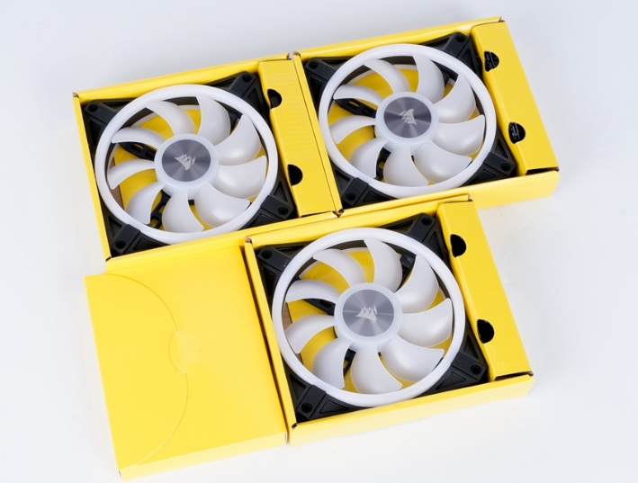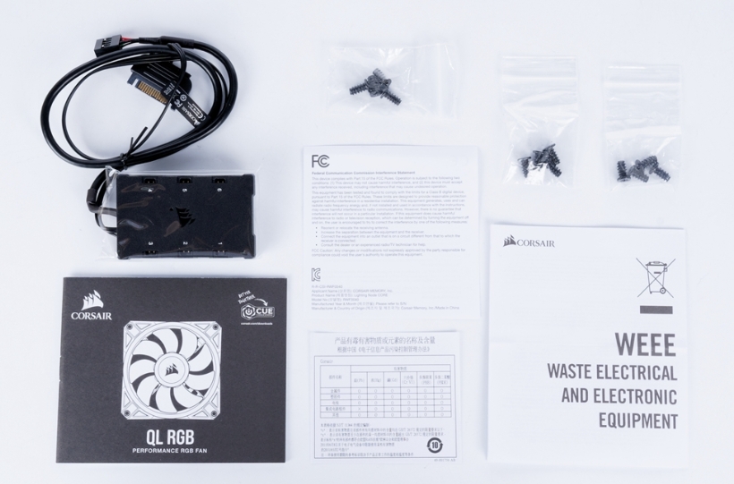Corsair QL120 RGB FAN 제품은 각 팬마다 층으로 구성되어있는 박싱으로 구성되어 있습니다. 또한 내부에는 별도의 컨트롤러가 존재합니다. 이로인하여 별도의 컨트롤러를 구매할 필요가 없어지게 됩니다. 상품 구성은 컨트롤러, 120mm 팬, 나사, 설명서가 동봉되어져 있습니다.