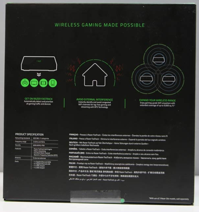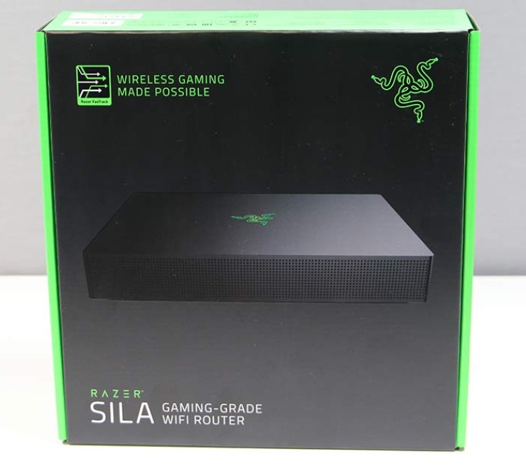 Razer Sila 제품의 박싱은 종이로된 박스에 내부 스티로폼을 활용하여 충격을 흡수할 수 설계되어 있습니다. 제품의 동봉품으로는 라우터, 케이블, 돼지코, 전원 어탭터, 이더넷 케이블이 동봉되어 있습니다.