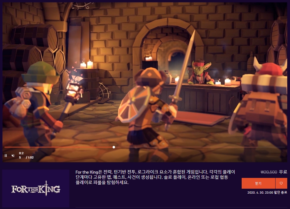 에픽게임즈가 저번주에 저스트커즈4에 이어 상당히 괜찮은 게임을 내놓았습니다. 이번주에는 FortheKing이라는 턴제 기반 어드벤처 게임인데, 상당히 평가도 괜찮으며, 나름 스토리와 저사양 PC에서도 구동이 가능할만큼 괜찮은 게임이기도 합니다.