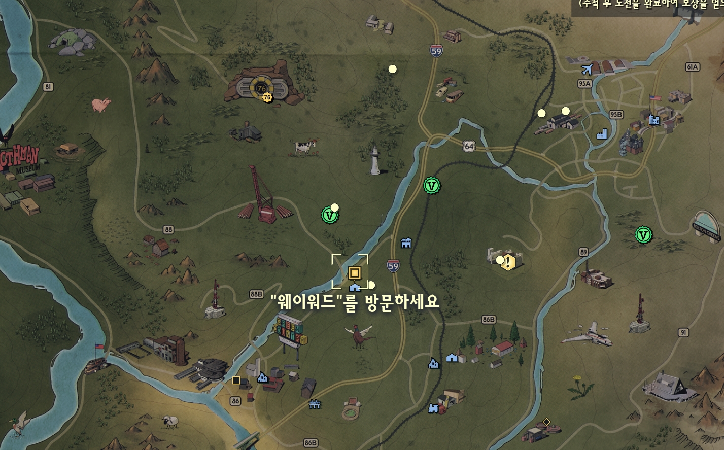 | 처음 시작한 폴아웃76에서 시계방향으로 5시쪽으로 향합니다. 그러면 웨이워드를 확인하실 수 있습니다. 그리고 문에서 들어가 주세요. |
