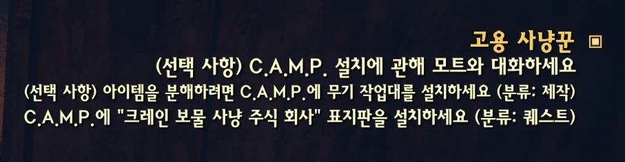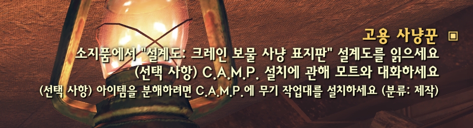 내 캠프 E 제작을 클릭하여 퀘스트 목록으로 가셔서 "크레인 사냥 주식 회사 표지판을 설치해줍니다.
