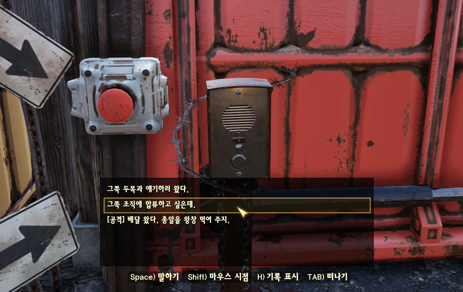 인터폰을 클릭하게 되면 꼭 조직에 합류하고 싶다고 말합니다. 행운 능력치가 +4일경우 두목을 쉽게 만날 수 있으니 버프약이나 행운을 4까지 찍도록 합니다. 만약 행운 4가 아니어도 두목을 만날 수 있으니 공격조건만 피하도록 합니다.