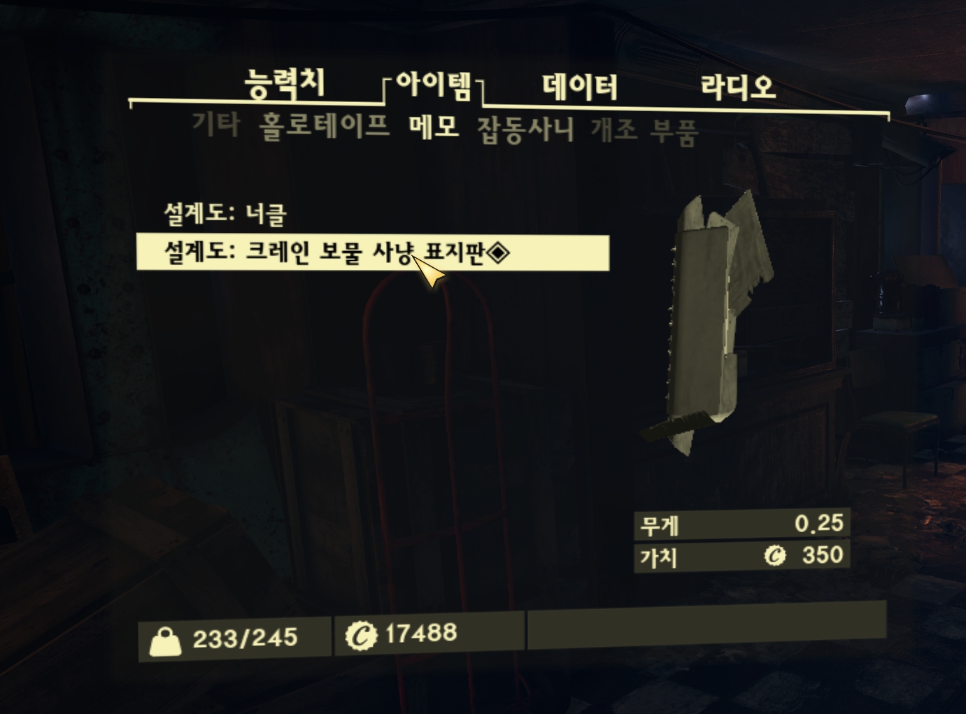 상태창(i) > 아이템 > 메모 > 설계도 크레인의 보물 사냥 표지판을 습득해주세요.