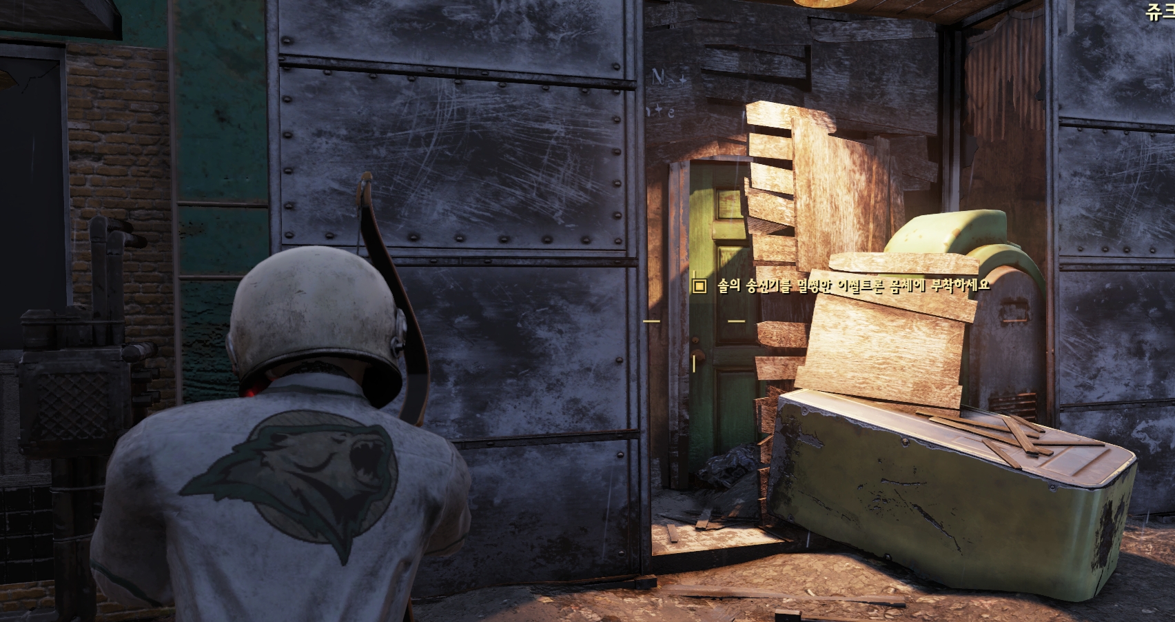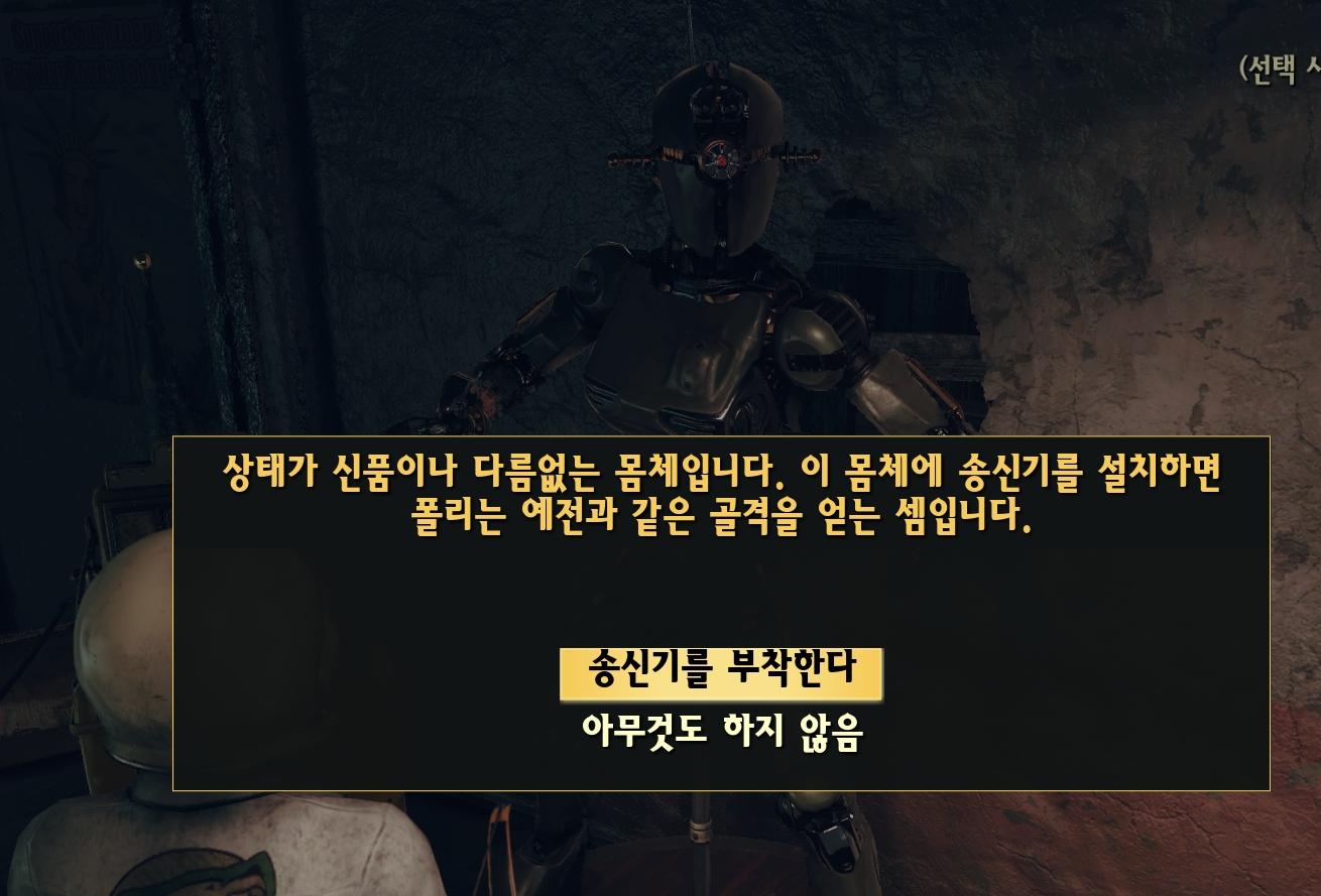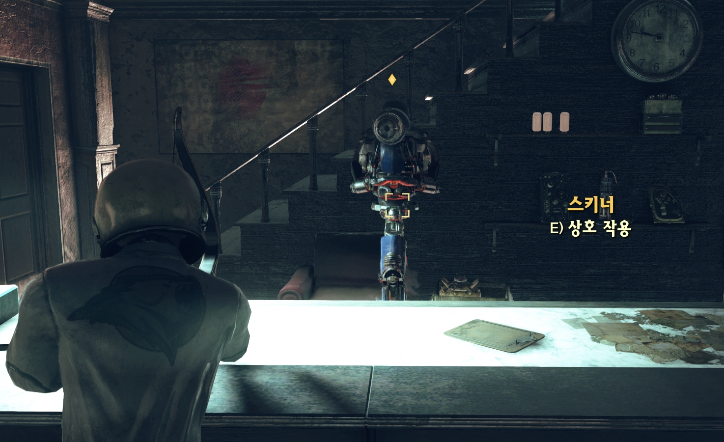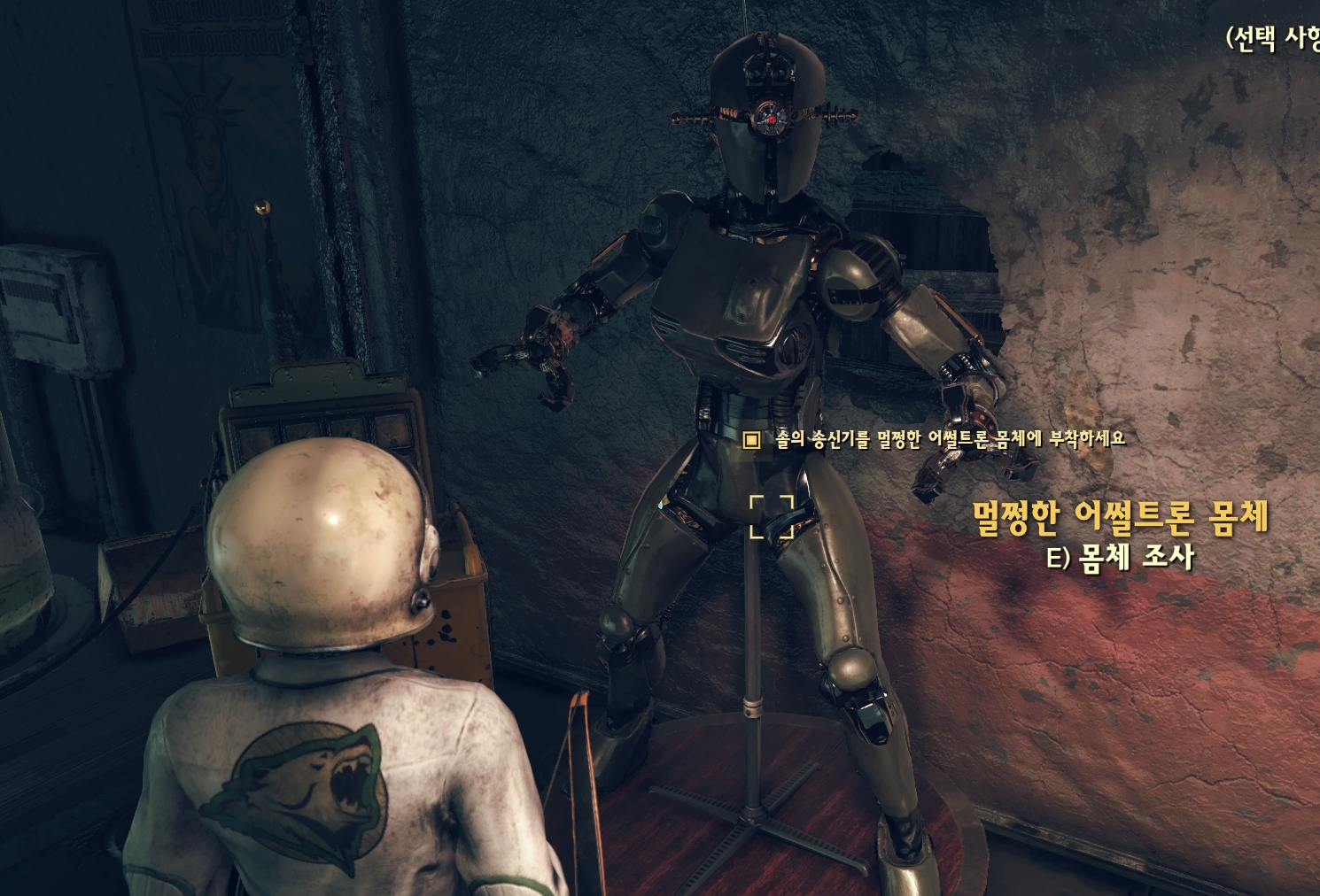 힘으로 뺏은 카드를 스키너 NPC의 뒤쪽 계단으로 올라가서 카드로 문을 열고 내부에 있는 골격에 송신기를 부착 합니다