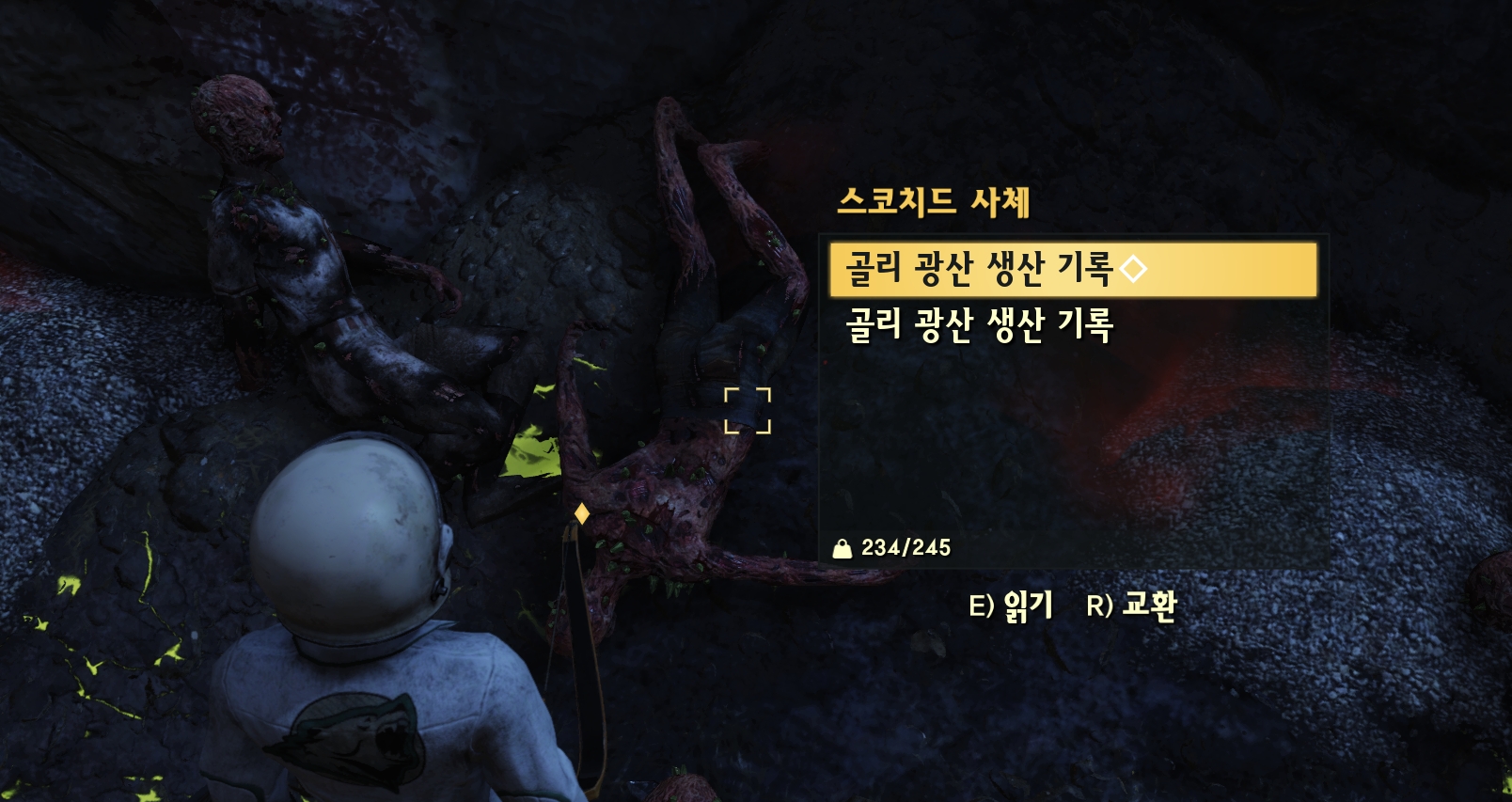 이 신호로 맵에 표시된 지역으로 이동을 해줍니다. 해당 지역에 이렇게 스코치드 사체들이 있는데 사체들을 보면 골리 광산 생산 기록을 획득 하실 수 있습니다.