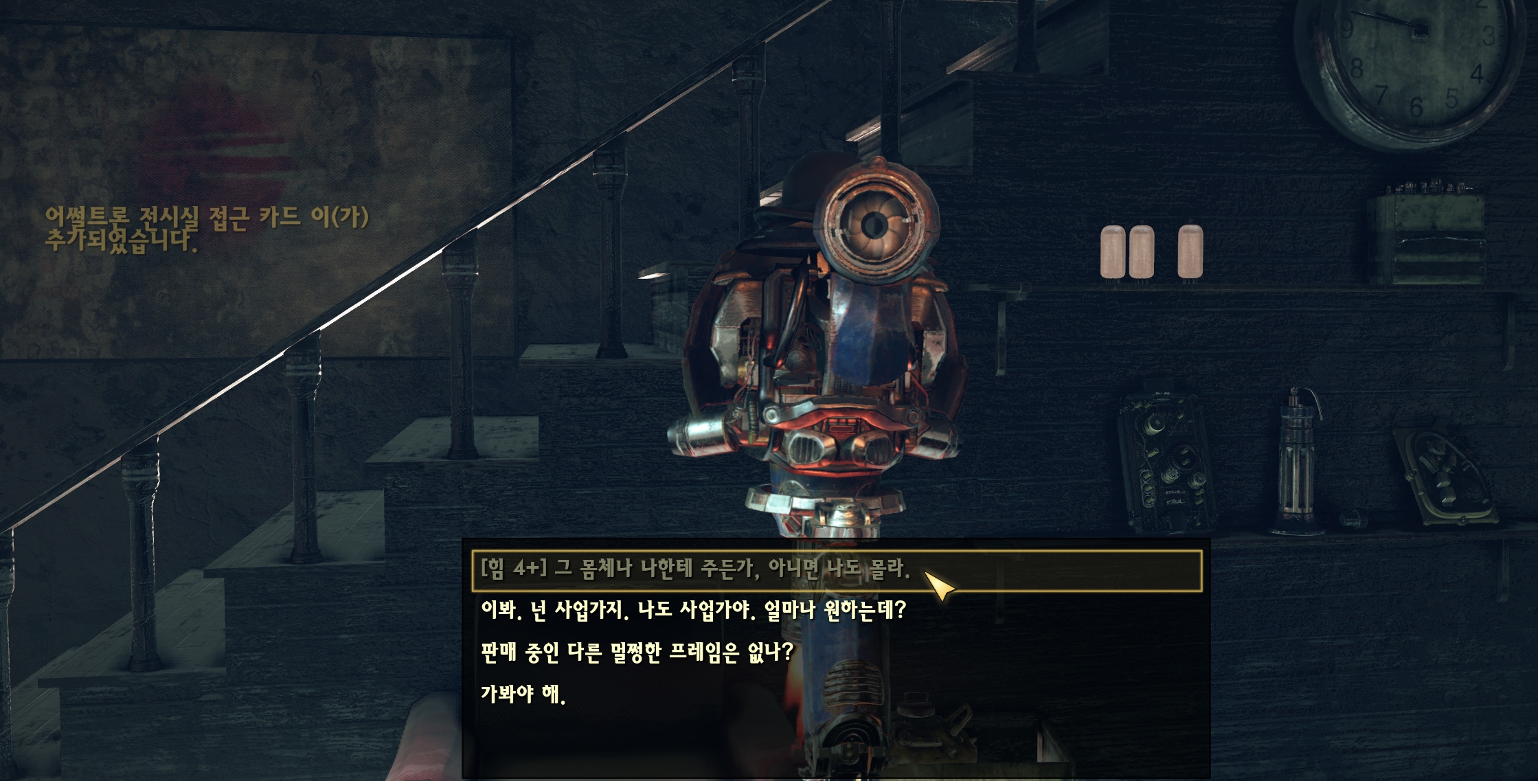 이런 문으로 들어가시면 획득하신 카드로 스키너와 대화를 해주시면 됩니다. 여기서 중요한 점이 있는데, 힘+4 이상 일 경우 카드를 매우 쉽게 획득하실 수 있습니다.