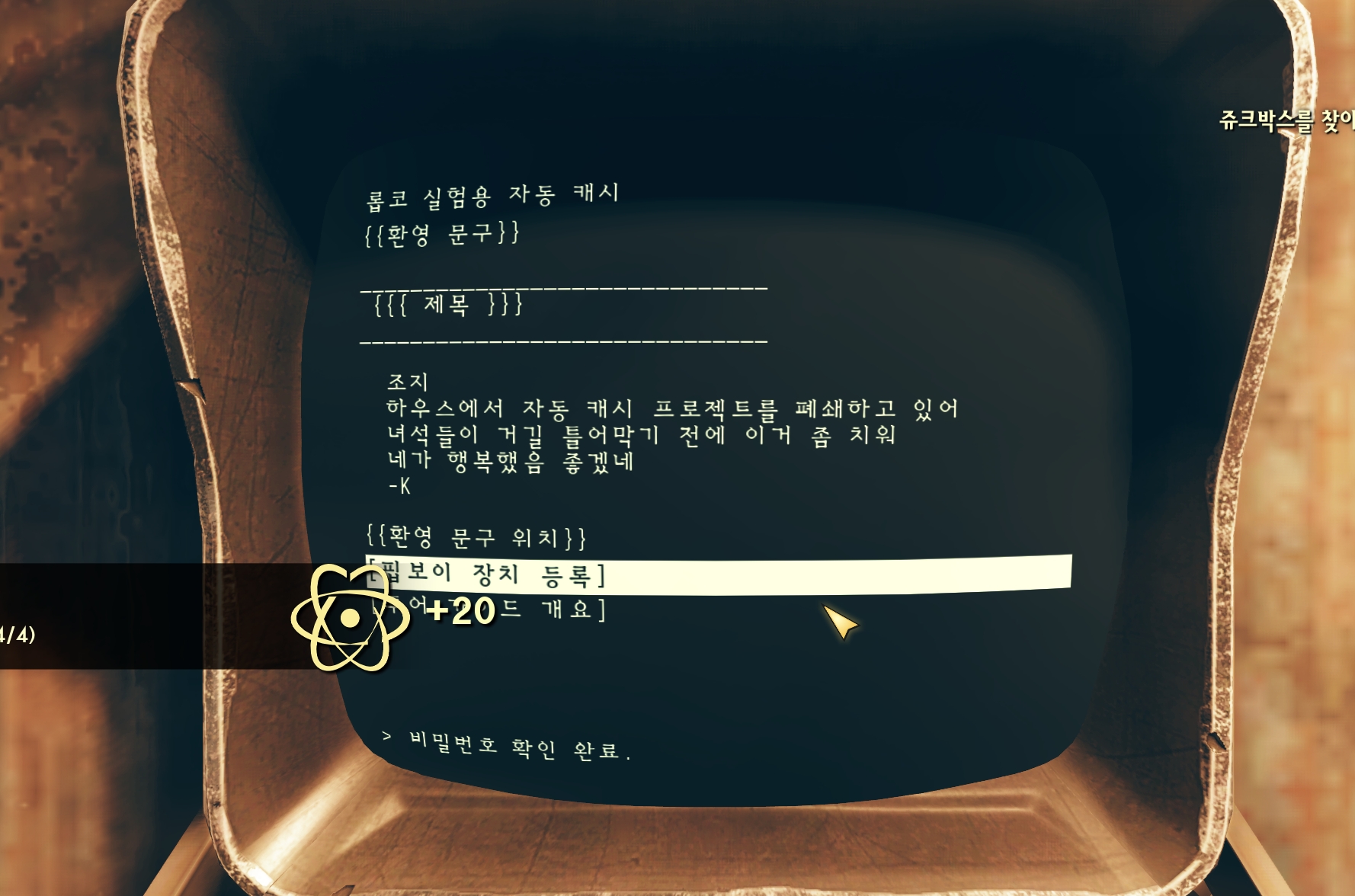 해킹은 요구레벨도 없고, 실패해도 다시 재도전 할 수 있으니 아무 단어나 클릭을 해줍니다. 이후 핍보이 장치 등록을 해주시면 됩니다.